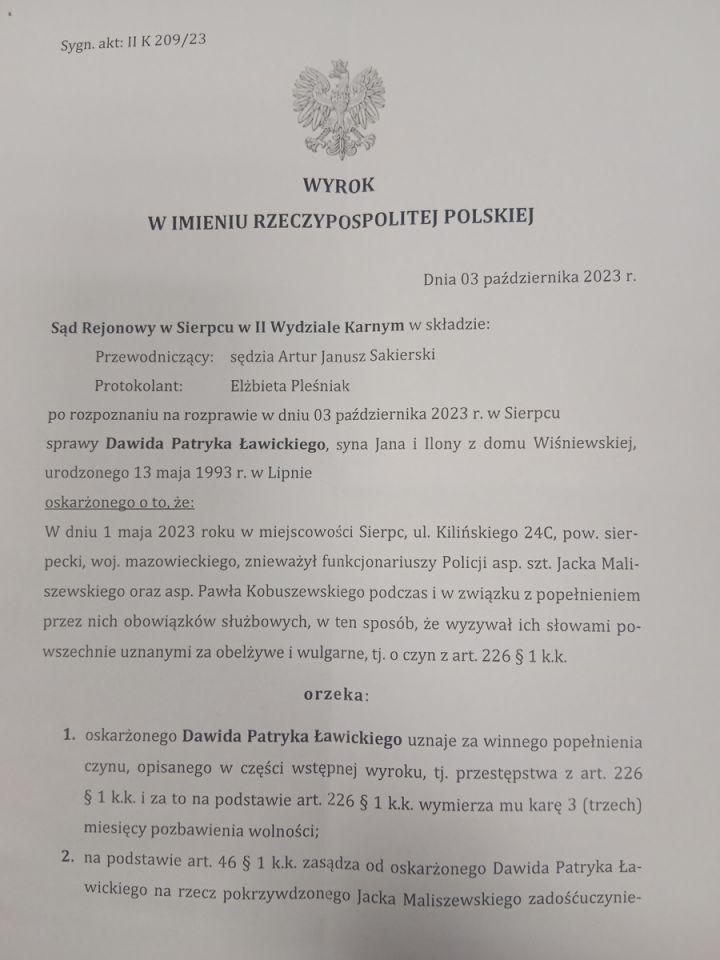 Decyzją Sądu Rejonowego w Sierpcu publikujemy wyrok skazujący Dawida Ławickiego ( ur. 1993r.), oskarżonego o czyn z art. 226 §1 kodeksu karnego. Oskarżony został uznany za winnego.